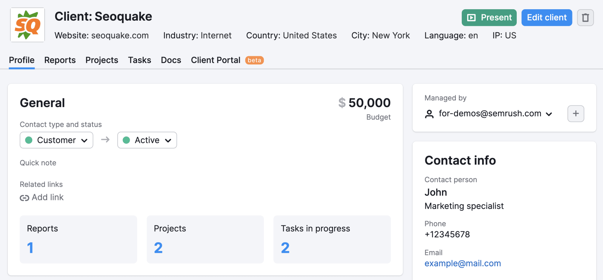 Semrush CRM lets you store all client information and communication in the same platform. This helps agencies drastically reduce the amount of time they spend searching across different channels for important information about specific clients.