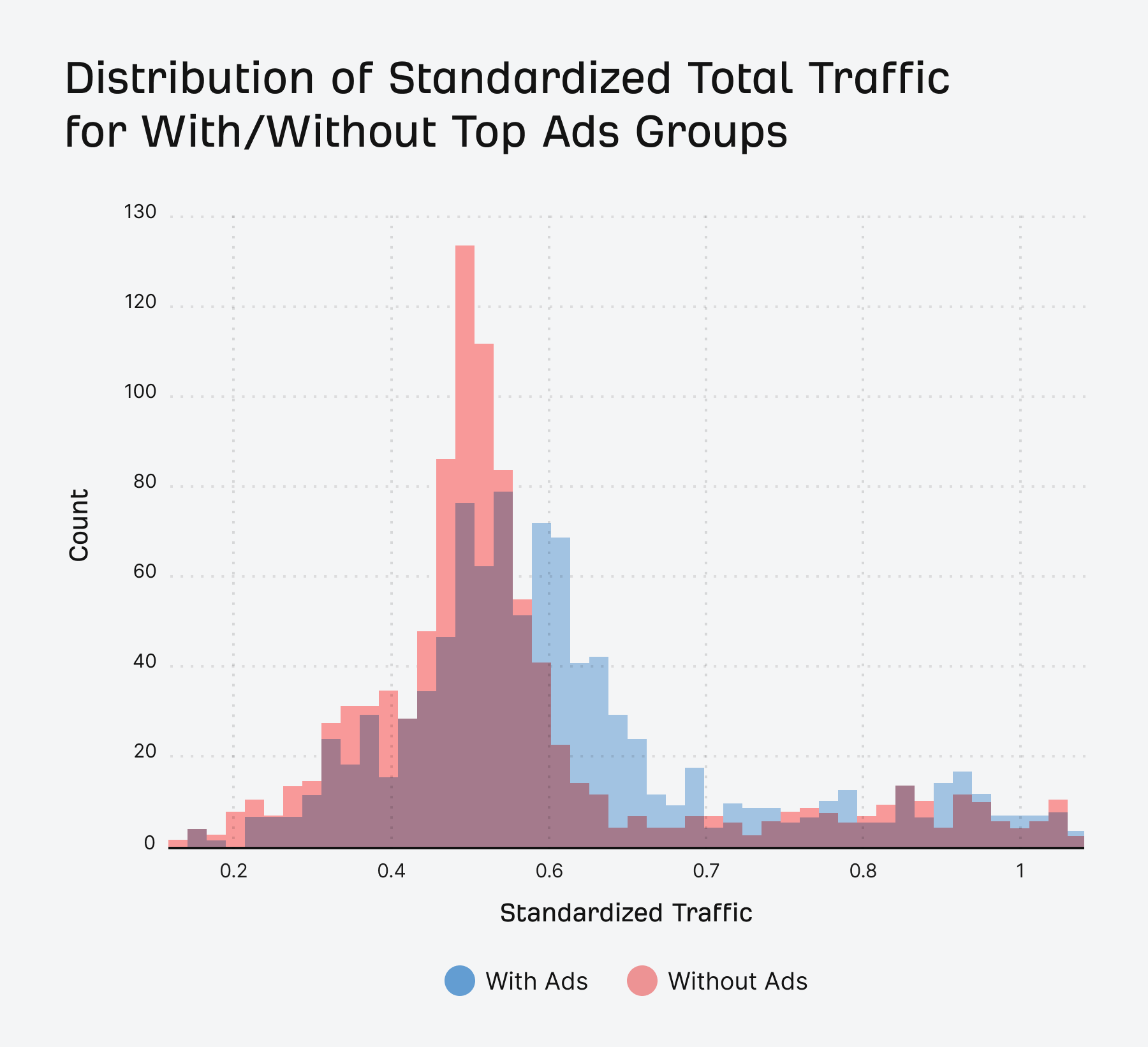 As you can see, running ads shifts traffic towards higher standardized values, meaning more overall traffic.