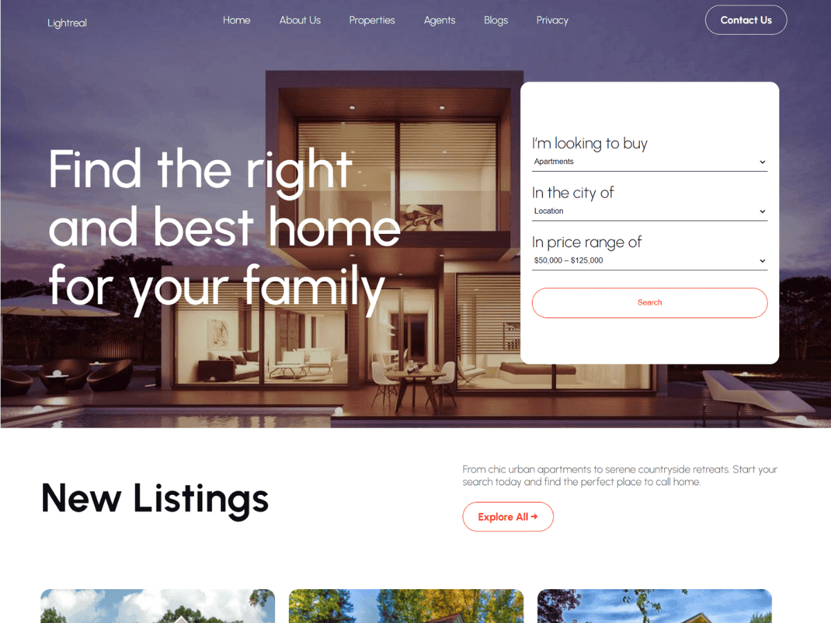 Lightreal is a premium WordPress theme designed specifically for real estate agencies. It features a sleek, modern design with smooth scrolling for a seamless user experience. Lightreal offers customizable templates tailored to showcase properties beautifully, with a focus on usability and aesthetics. Ideal for showcasing real estate listings, the theme provides a responsive layout, intuitive navigation, and high-quality design elements to help agencies stand out and captivate potential clients.