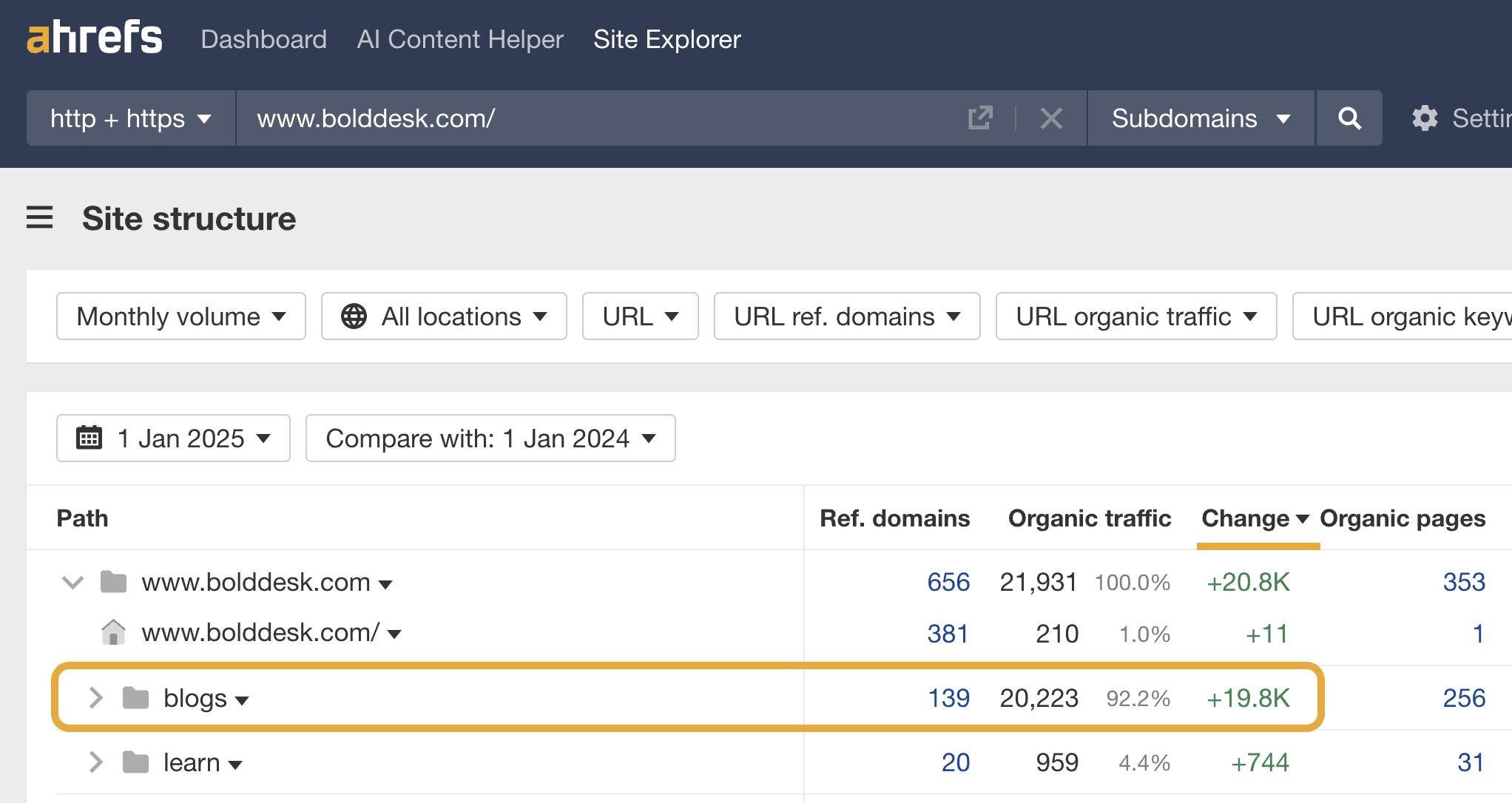 BoldDesk’s traffic growth over the last year can be attributed to the strength of the content marketing on their blog, going by Ahrefs’ Site Structure report.